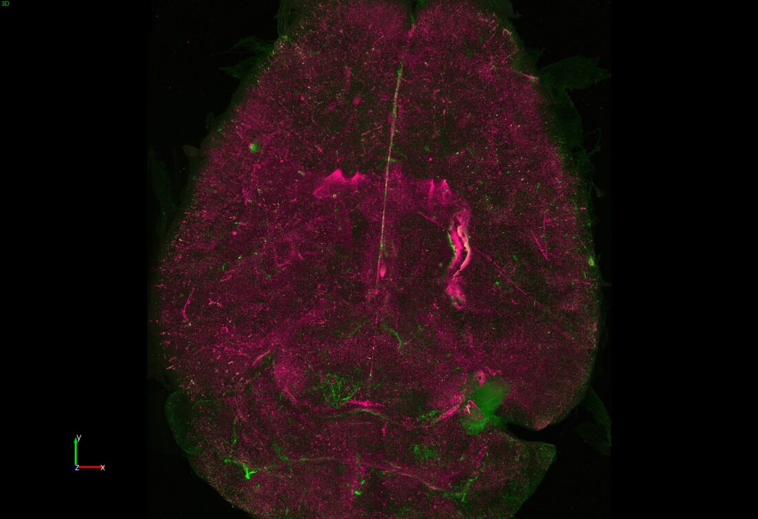 Description: Whole-brain imaging using an innovative light-sheet microscopy (SLICE) system was applied to visualize the timeline of EcoHIV distribution and the colocalization of NLRP3 inflammasome activation in the mouse brain.